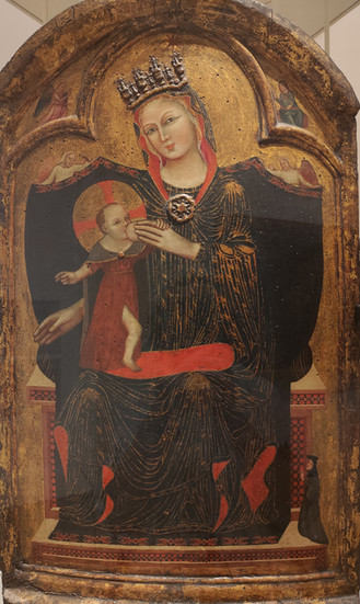 La piccola figura che si vede nell'angolo destro dell'immagine (a destra di chi osserva ma a sinistra della Vergine e di Gesù, posto d'onore per lo spettatore, ma lato 'femminile' e 'modesto' per il personaggio raffigurato) ha diverse caratteristiche che io indicherei come femminili - la forma 'scivolata' della veste, le maniche aderenti, l'anello sulla mano sinistra, e, soprattutto, la forma del copricapo, che sembra un velo nero con soggolo indossato con una ghirlanda nello stesso tessuto -. Inoltre, la particolare iconografia del dipinto - la Madonna del Latte - mi fanno propendere più per una committente, forse una donna non più troppo giovane (per gli standard dell'epoca) che dispera di avere figli e veste in modo dimesso (ma non troppo!) nell'invocare un aiuto spirituale.